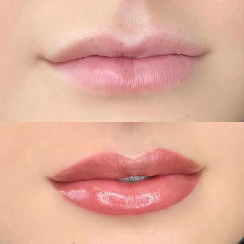 During the lip blush procedure, the corners of the lips are fully treated with pigment, while the shading becomes less noticeable towards the center. This creates a gradient effect, similar to an ombre look. The overall result is a light tone that enhances the lips and gives them a fuller appearance.